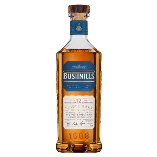 Bushmills 12 Year Old Single Malt Whiskey is a full-bodied, deep amber whiskey that is both complex and approachable. The whiskey is triple-distilled from 100% malted barley and matured for a minimum of 11 years in former sherry casks and bourbon casks, before combining and finishing for 6-9 months in Marsala wine casks, creating a whiskey rich in dried fruit and nut flavors.