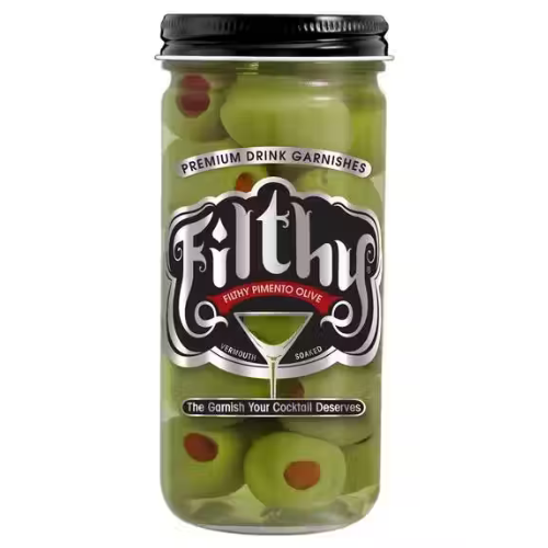 Our hand-selected queen olives are stuffed with the succulent, sweet flesh of a heart-shaped pimento pepper. Bathed in our uniquely blended ‘Filthy’ brine, this fashionably Filthy Olive complements your premium vodka or gin-filled drink. The Filthy Pimento Olive is the Martini and Bloody Mary garnish choice of some of the best bars in the world.