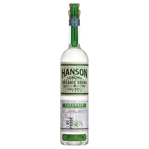 Hanson of Sonoma Organic Cucumber Vodka is a Grape-Based, Family Made Vodka crafted in Sonoma/Carneros region of California by Hanson 1st and 2nd generation family members. An award-winning addition to your craft cocktail home bar, Hanson of Sonoma Vodka earned 91 Points from San Diego International Wine & Spirits. Perfect for mixed drinks, this vodka liquor is 100% USDA Certified Organic, Non-GMO, Carb Free, Gluten Free, Sugar Free and only 96 calories per 1.5 ounces. This Organic Vodka drink is crafted from mostly French Colombard white grapes with hand-cut, hand-peeled organic cucumbers and distilled from a copper column still + copper pot still + copper pot still with cognac head. The result is a 100% pure distillate liquor that tasted refreshing with notes of hibiscus, cilantro and a minty finish. Enjoy Hanson of Sonoma Organic Cucumber Vodka with caviar, oysters, cheese, and charcuterie. Hanson of Sonoma Original is exceptional neat and pairs perfectly in Cucumber Gimlets, Cucumber Mojitos, Cucumber Martinis and other craft cocktails. 40% alcohol by volume, 80 proof liquor.