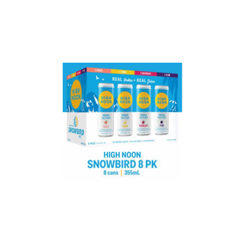 Made with real vodka & real juice, the High Noon Vodka Seltzer Snowbird Pack features 4 High Noon Vodka Seltzer flavors. Each 8 Pack comes with 2 cans of each flavor: Peach, Lemon, and NEW FLAVORS, Raspberry and Plum. Each can is 12 oz (355mL). Only 100 calories, no added sugar and gluten free.