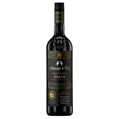 Experience the sweet life when you open a wine bottle of Menage a Trois Sweet Collection Dolce Sweet Red Wine. Brimming with decadent blackberry and raspberry flavors accented by warm notes of vanilla, this sweet red wine blend is lively on the palate, lifted by delicate, light carbonation and crisp acidity. Muscat lends its sweet notes for a decadent foundation followed by jammy fruit flavors from Zinfandel and bold, dark fruit character from Syrah for intensity and depth. This wine was awarded 90 Points by the Tasting Panel in the April/May 2021 issue. Pair this sweet red wine blend with chocolate desserts and spicy meats. Gentle wine making processes and cold fermentation help maintain the rich, sweet flavors and aromas of grapes sourced from California's best vineyards. This bottled wine has 9.5% alcohol by volume and features a screw cap for easy opening—no corkscrew required. Menage a Trois offers a robust portfolio of award-winning wines that consistently delight with a high-quality experience.