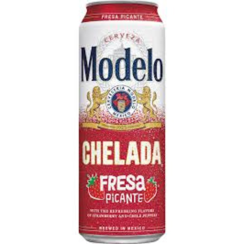 A Modelo Chelada Fresa Picante is a Mexican-style flavored beer, essentially a michelada, that combines the sweet taste of strawberry with a subtle kick of chili pepper spice, offering a balanced sweet and savory flavor profile, all made with authentic Mexican beer; it's typically served in a 24oz can and is considered a refreshing drink with a distinct strawberry taste.