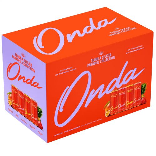 MANGO-PASSION FRUIT-PINEAPPLE-STRAWBERRY Onda is a premium Tequila Seltzer brand crafted with only natural ingredients. Available in a variety of light and refreshing flavors, Onda is made from a blend of blanco tequila, sparkling water, and real fruit juice. Each 12 oz can features 4.5% alcohol, 100 calories, and no added sugar. · Tequila Seltzer made with blanco tequila, real fruit juice, sparkling water and natural flavors · 100 Calories · No Added Sugar · Gluten Free
