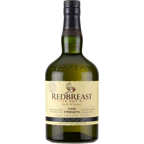 Made from a mash of malted and unmalted barley and then triple distilled in copper pot stills, Redbreast 12 boasts the flavor complexity and distinctive qualities of Pot Still whiskey. Matured in a combination of Bourbon seasoned American Oak barrels and Oloroso Sherry seasoned Spanish oak butts, the distinctive Redbreast sherry style is a joy to behold in each and every bottle. The Cask Strength expression gives a glimpse of Redbreast 12 in its natural, full flavored taste.