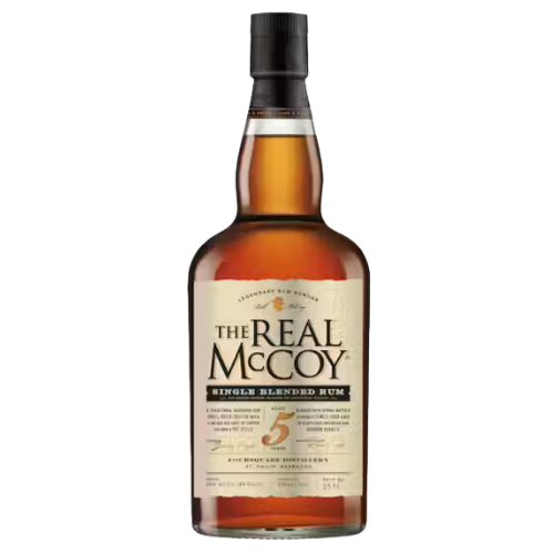 The Real McCoy Single Blended 5-Year Aged Rum is real rum; unmodified and made in small batches in copper pot and column stills, this Caribbean rum is tropically aged in American oak bourbon barrels without any added sugar*, flavor, or artificial color. Single sourced and produced by Foursquare Distillery, a 4th-generation family distillery in Barbados, this small batch rum is well-balanced and ideal for bourbon lovers. Brown sugar and dried fruit define the nose, with vanilla, toasted almond and caramel, honey, buttery cinnamon, and bourbon aged wood on the palate, followed by a lingering finish with hints of tobacco and coconut. Ideal for sipping neat or enjoying on the rocks, this 80-proof blended rum also works well in premium cocktails and your favorite rum drinks. Presented unadulterated in the Prohibition Tradition of legendary rum runner Bill McCoy, this is the genuine article…It's The Real McCoy. *Per 1.5 fl. oz. serving of average analysis: Calories 98, Carbs 0 grams, Protein 0 grams, Fat 0 grams, Gluten-free. Consume Considerately. © 2022 Imported by Real McCoy Spirits, Canandaigua, NY. 40% alc. by vol.