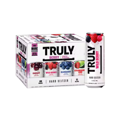 The Truly Berry Variety Pack is bursting with notes of exotic berry flavors like Wild Berry, Cherry, Blueberry and the newest addition-Strawberry Lime. With a hint of flavor, and made with real fruit juice from concentrate, there is a juicy berry flavor for everyone. Each 12oz. can of Truly has 5% alc./vol., 100 calories and 1g sugars for refreshment that won’t weigh you down. Three 12 oz. cans of each flavor. Gluten Free.