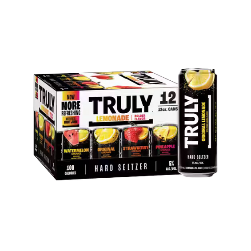 Truly Hard Seltzer Lemonade Mix Pack is the perfect mix of refreshing hard seltzer and sweet lemonade for a drink that’s big on taste and light on calories and sugar. Truly Lemonade comes in four delicious flavors: Original Lemonade, Strawberry Lemonade, Watermelon Lemonade, and Pineapple Lemonade. Now made with real fruit juice, Truly’s best flavors just got even better. Each 12oz. can has 100 calories, 5% alc./vol. and 1g sugars for refreshment that won’t weigh you down. Mix pack includes three cans of each flavored hard seltzer. Variety 12 pack, 12 fluid ounce cans.